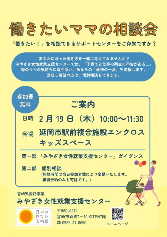 - イベント 2026年01月15日 ※日程変更【2/5➡2/19 延岡エンクロス】働きたいママの相談会を開催します!
