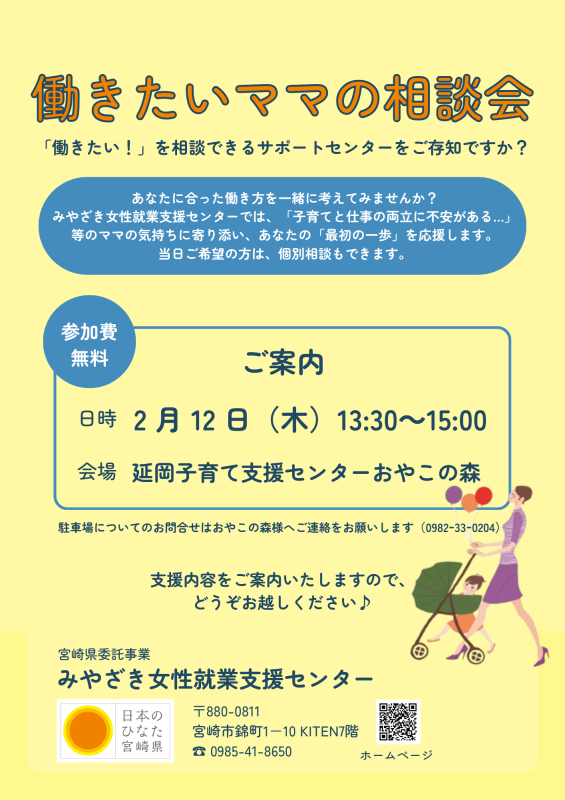 託児サービスや延岡・都城の窓口をご利用の場合は、予めお電話でご予約ください。